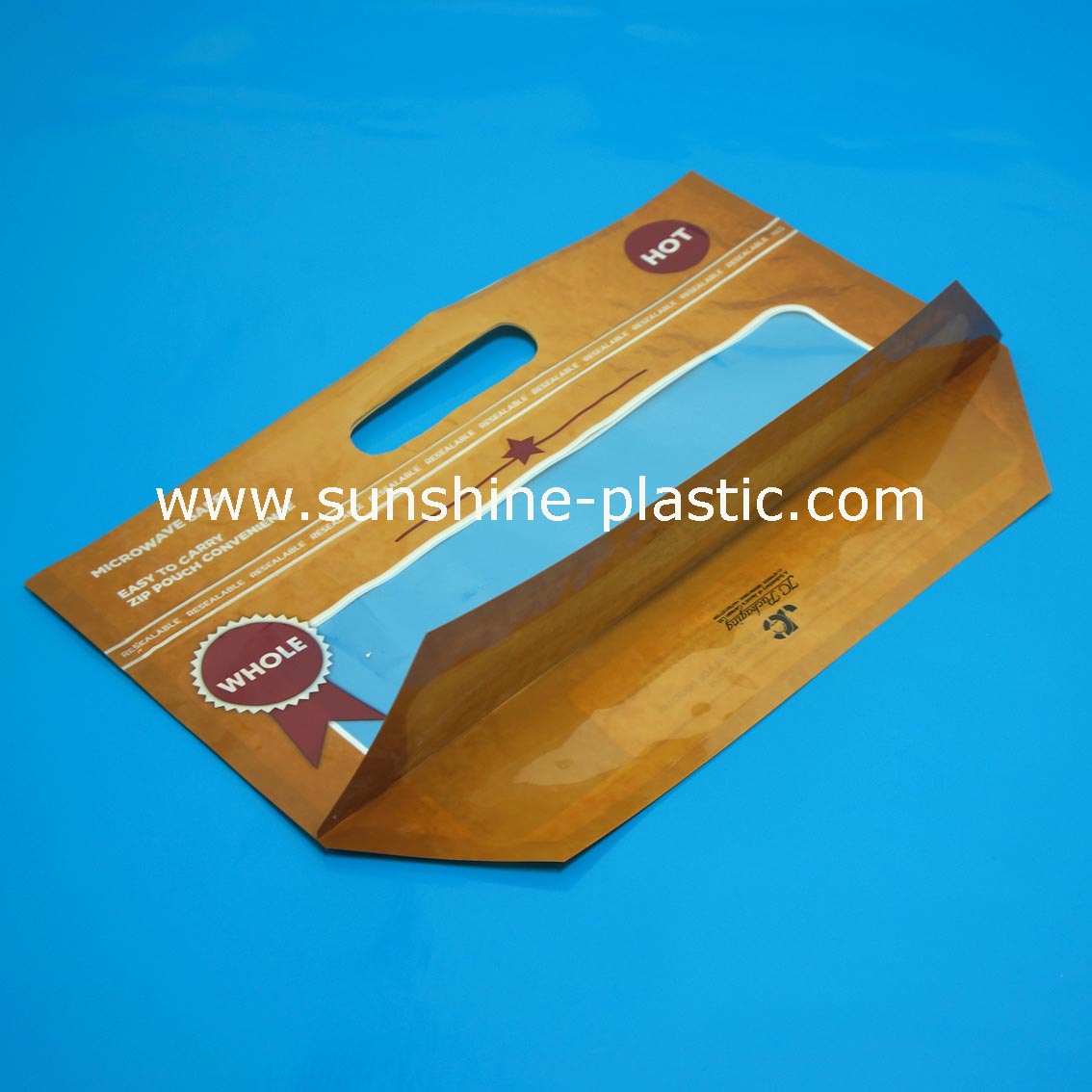 袋型:三边热封K型袋,宽边封线,开口有凹凸条可以开合,底部有斜边插角。
